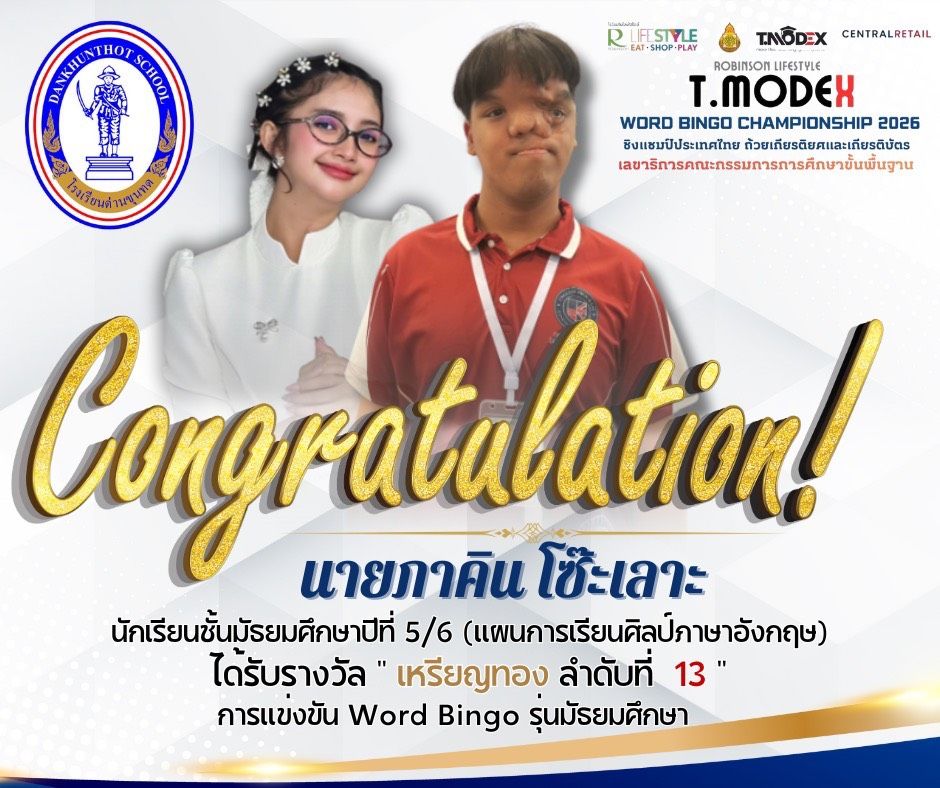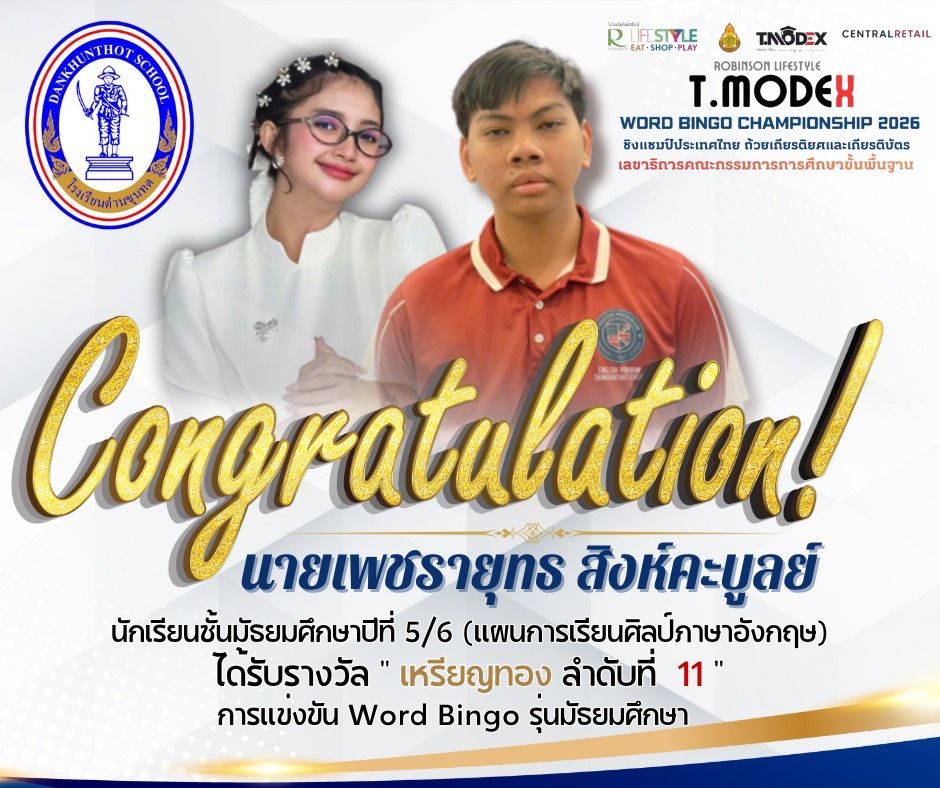 การแข่งขัน Word Bingo รุ่นมัธยมศึกษา รายการ ❤️????มหกรรมกีฬาวิชาการเพื่อการศึกษา ROBINSON LIFESTYLE T.MODEX WORD BINGO CHAMPIONSHIP 2026 ระดับประเทศ ???????????? ชิงถ้วยเกียรติยศเลขาธิการคณะกรรมการการศึกษาขั้นพื้นฐาน วันที่ 17 มกราคม 2569 ณ ศูนย์การค้าโรบินสันไลฟ์สไตล์ ร้อยเอ็ด